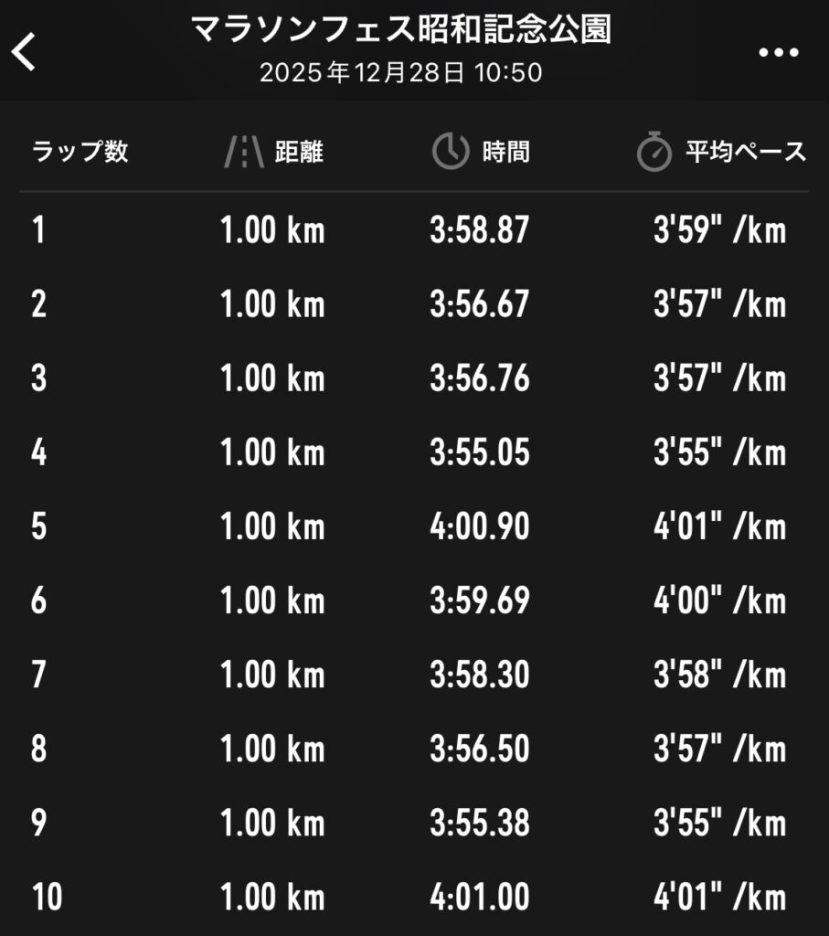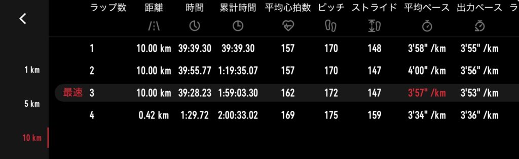 最初の1kmの入りは、3:59/kmと幸先の良いスタート!