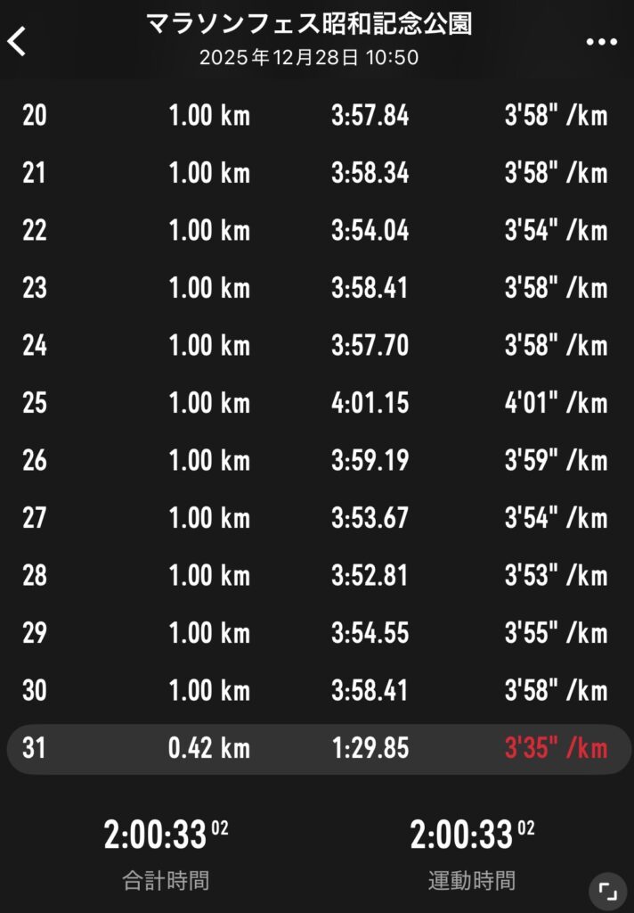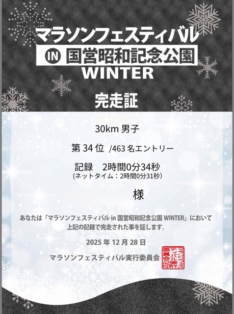 2025年最後の日曜日となる12月28日(日)に、東京・西立川で開催された【マラソンフェスティバル in 国営昭和記念公園 WINTER】の30kmの部門に出場してきました。