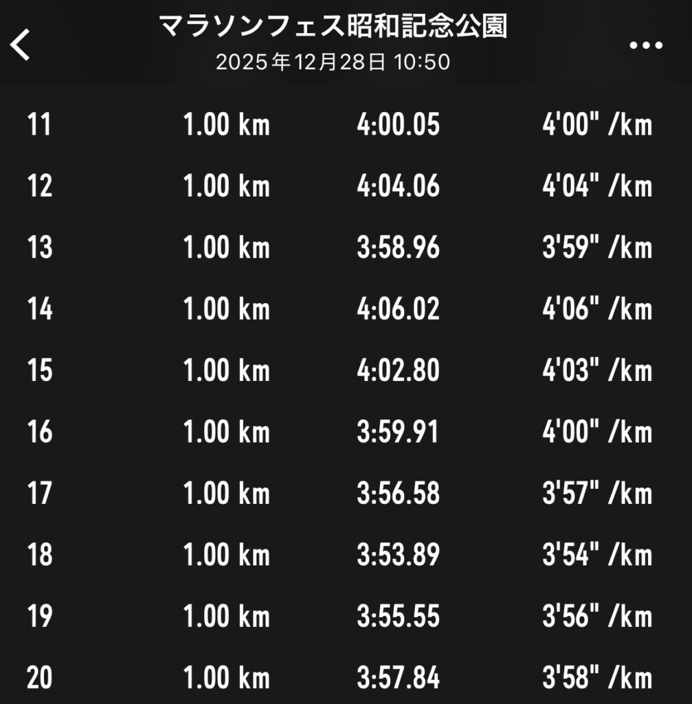 最初の1周目(5km)は19:48で、3:58/kmペースと上出来の入り。