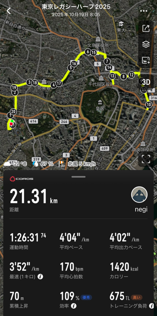 しかし、COROSで走った2025年10月の【東京レガシーハーフ2025】では狂うことなく、正確なログを記録しています。