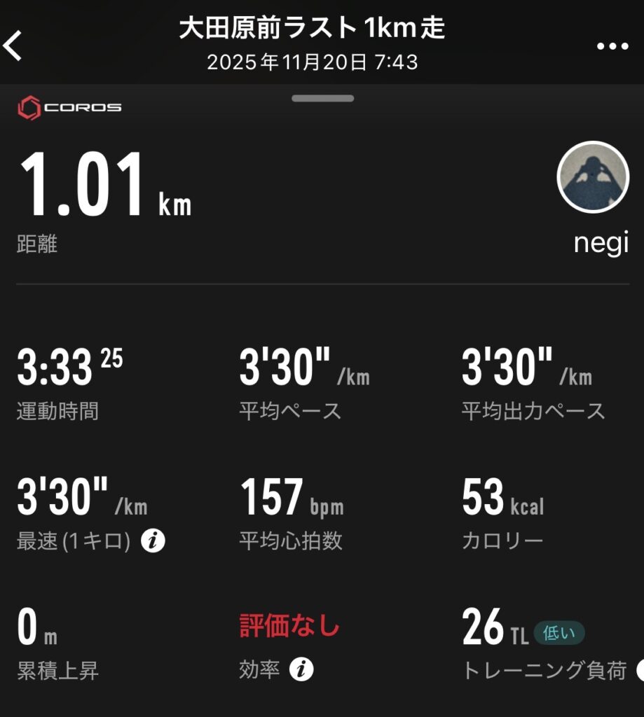 【3日前】ペース走3kmの刺激入れ(※アップとクールダウン挟む)→1km刺激走に変更