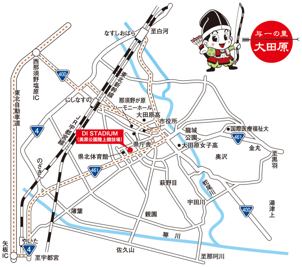 と最寄りの駅からでも徒歩ではだいぶ時間が掛かるので、タクシーもしくは「那須塩原駅」および「西那須野駅」と大会会場を結ぶ無料送迎バスが運行されるので、こちらを利用した方が確実でしょう。