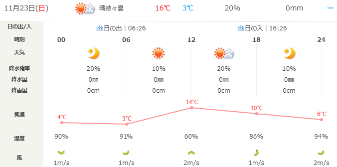 最高気温16℃、最低気温3℃、湿度70%前後(スタート時)