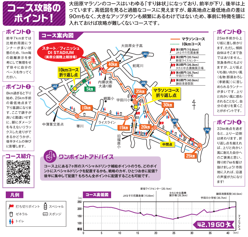 高低差に関しては約90mとあり、最も疲労が溜まってくる35km前の上り坂が一番の難所となりそうです!