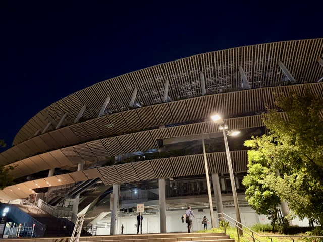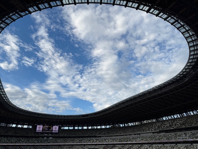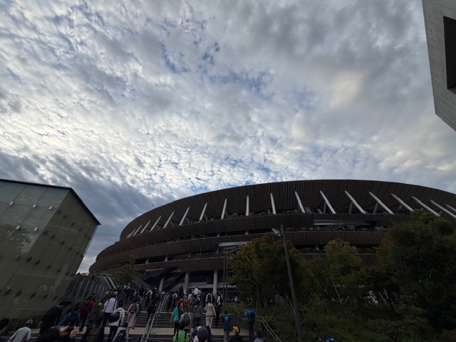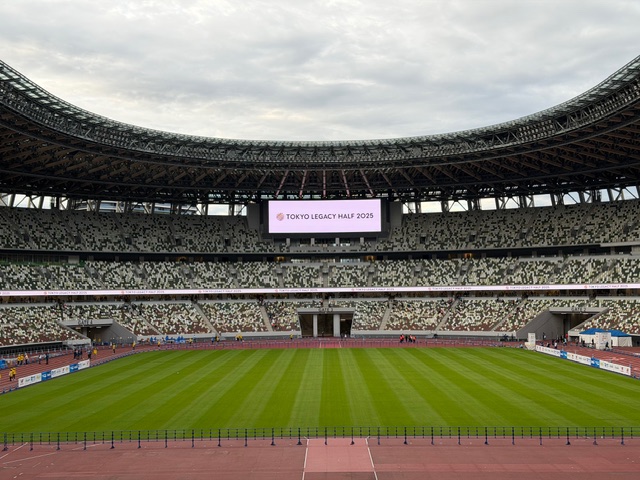 周りがどんどん下り坂を使ってペースを上げていく中、ようやく見えてきた国立競技場。