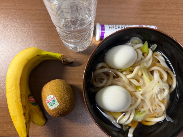 5:00 朝食(ゆで卵入りうどん、バナナ2本、キウイ、PH1500 電解質タブレットを溶かしたミネラルウォーター500ml)