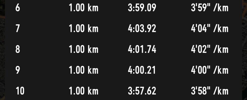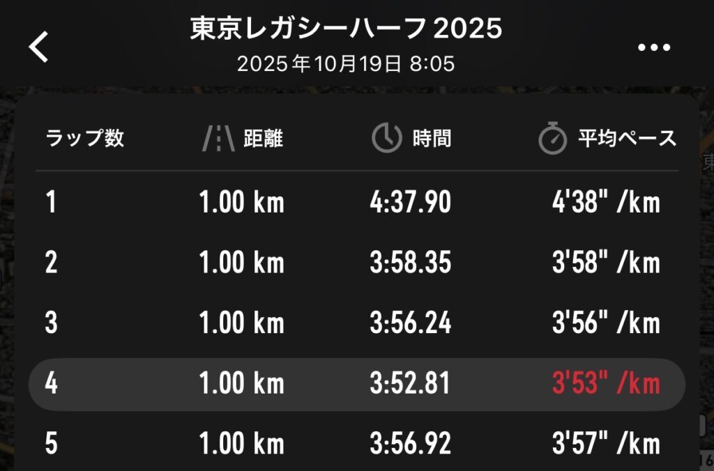 特に(1)が喫緊の課題のため、前半で貯金をつくりながら4:00/km平均ラップを意識したレースプランでした。