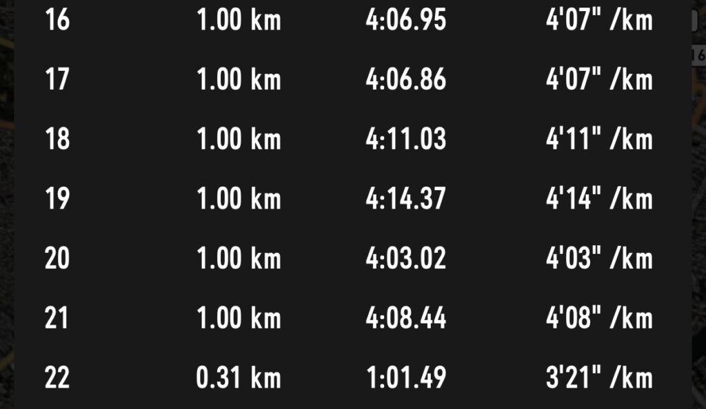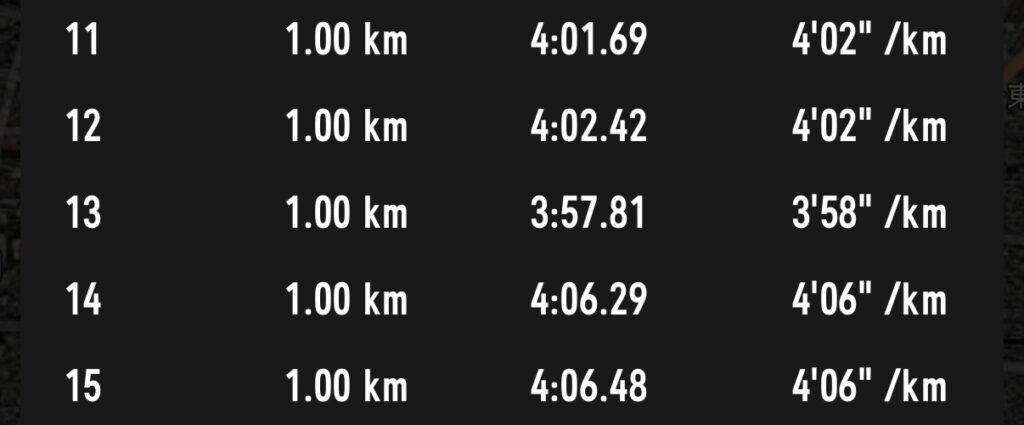 14km以降は4:06~4:07/kn台と落ち始めると同時に、弱気な自分がヒソヒソと心の中で呟いてきます。