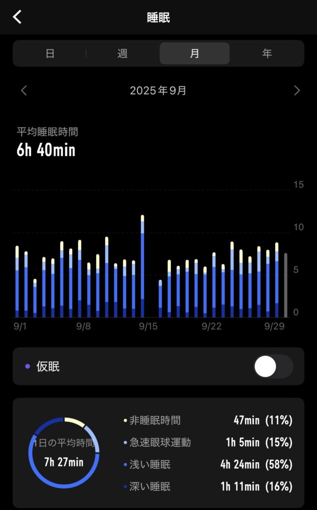 月の平均睡眠時間も6時間40分(8月から△6分)、眠りだしてから起きるまでの布団に入っている時間は7時間27分(8月から△6分)と、ようやく眠りやすくなったおかげでどちらも10分前月よりアップしていました。