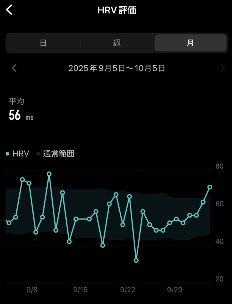 緩やかに低下し、−1msは誤差範囲とのことですが、9月末からの本格的なトレーニング再開の影響が出ている可能性が高いです。