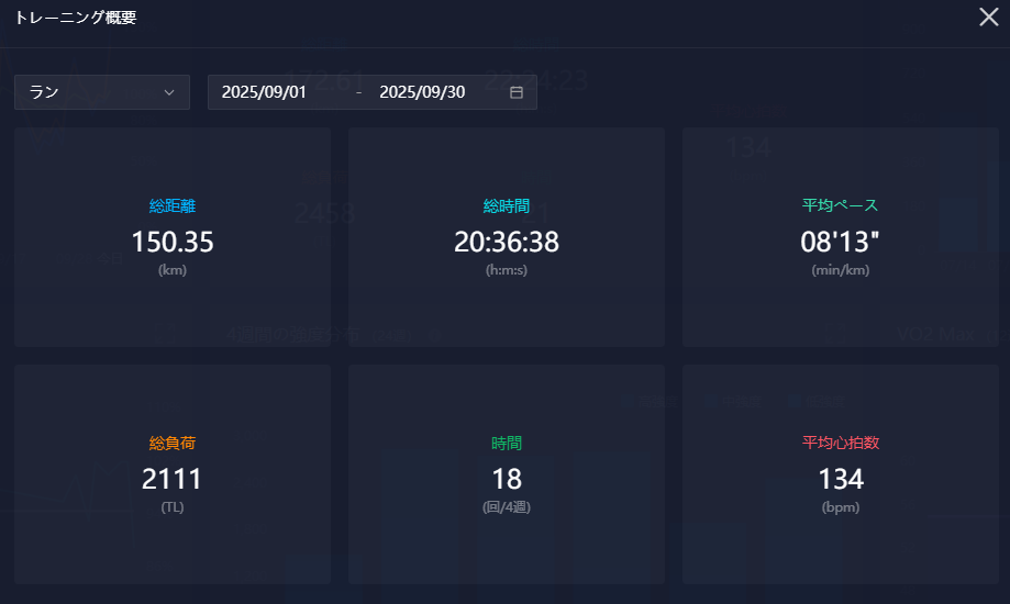 9月も前半は猛暑や蒸し暑い日が続く中、週末のセット練習をメインに合計18ラン、走行距離は150.3kmでした。