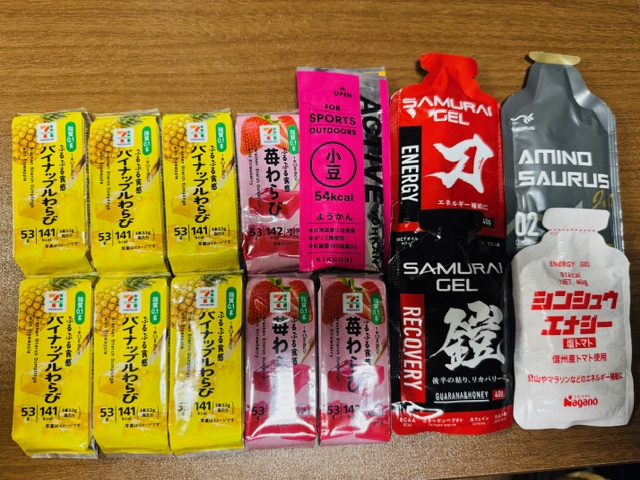 在庫処分かねて、これまでの大会でもらったジェルを消費しようと色々なメーカージェルを持っていきましたが、結局主に摂取したのはアミノサウルス、経口補水ゼリー、わらび餅でした。