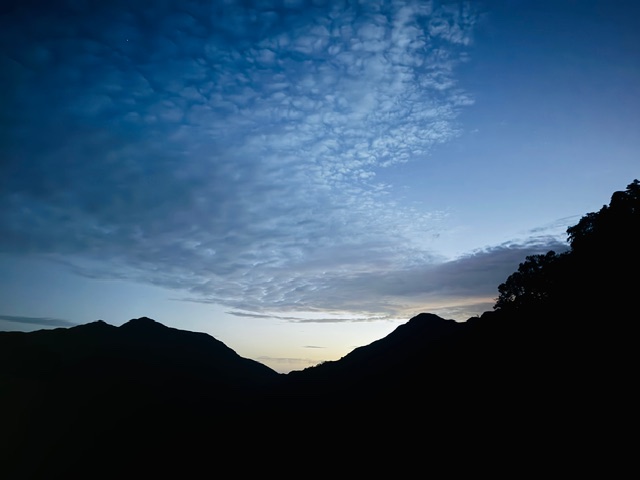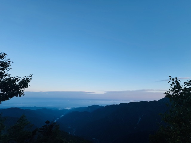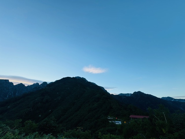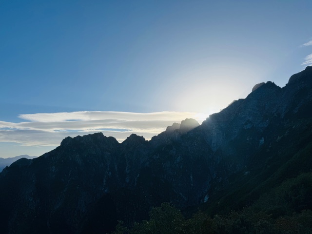 5:00前になるとようやく山の間から日の出がスタートし、暗黒の世界から少しずつ周りの山々の絶景が見え始めてきます。鳥も鳴き始め、一日が動き出すこの瞬間は登山をしていて好きな時間のひとつ。