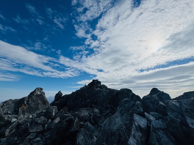 汗だくになった身体に吹く冷たい風が一気に身体の熱を奪っていくので、Tシャツ、アームカバー、シェルを羽織り、おにぎりとジェルを補給、さらに強烈な紫外線対策として日焼け止めクリームを塗って準備万全でいざ頂上へ。