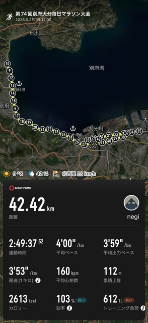 今回の別大では幸いにも8~10℃、湿度40%台、強風の影響は前半と終盤のみとコンディションにも恵まれましたが、それでも35km以降は耐え時でいつ脚にトラブルが起きてもおかしくないギリギリの状況でした。