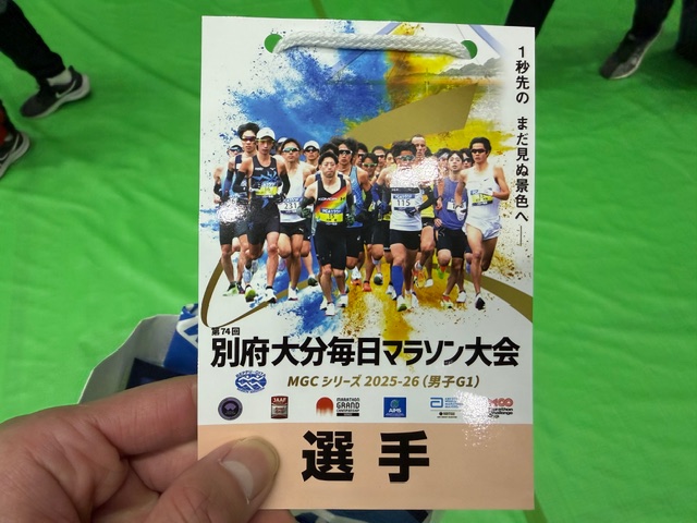 QRコードを読み込むと、ゼッケン、パンフレット、荷物預り袋など一式を手渡された中でも最もテンションが上がるのは別大ならではの選手首下げ。