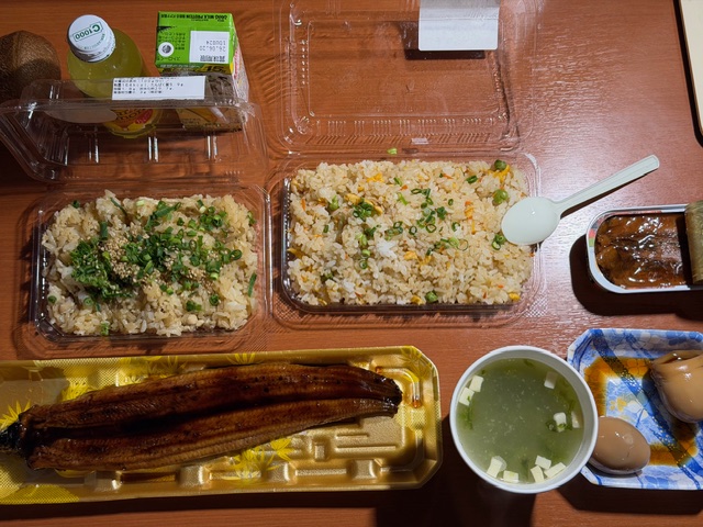 18:30 夕食(うなぎ、とりめし、炒飯、さんまの缶詰、煮卵2個、味噌汁、キウイ2個、プロテイン、レモン水、モルテンドリンクミックス320)