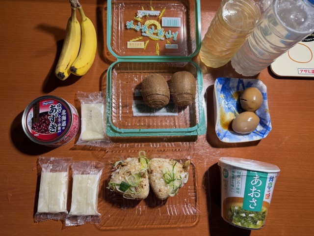 7:00 朝食(スタート5時間前、おにぎり2個、切り餅3個、あずき、煮卵2個、味噌汁、キウイ2個、バナナ2本、モルテンドリンクミックス320を250ml、サウルススポーツドリンクエリートを適量)