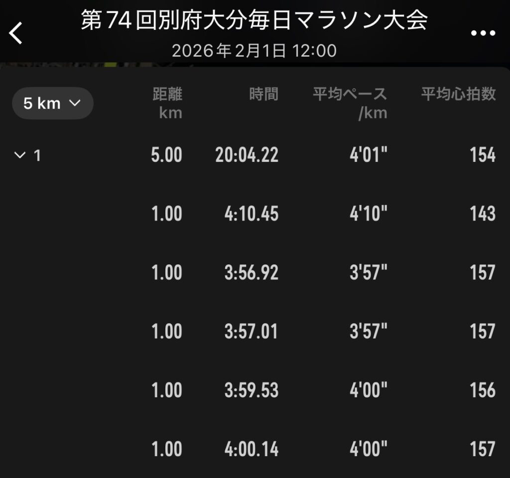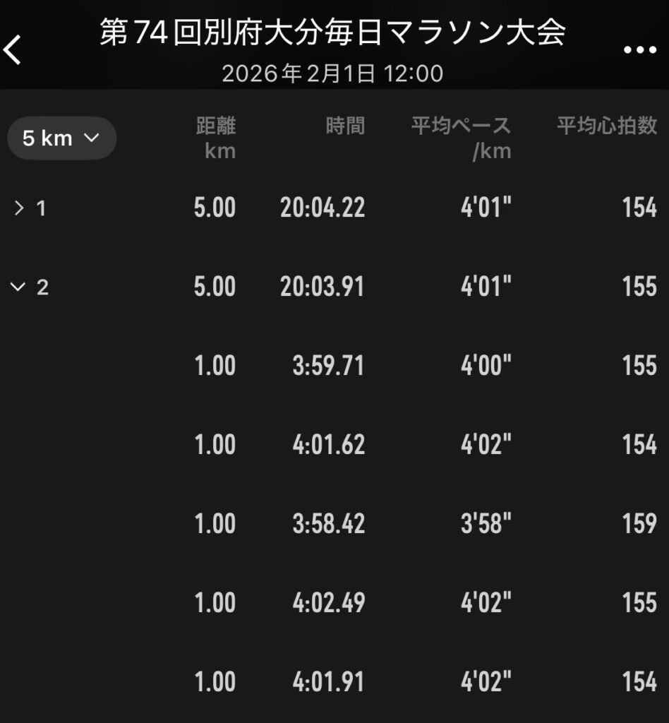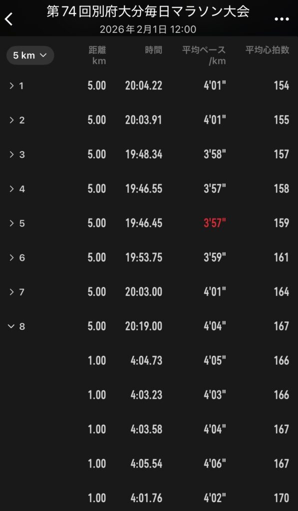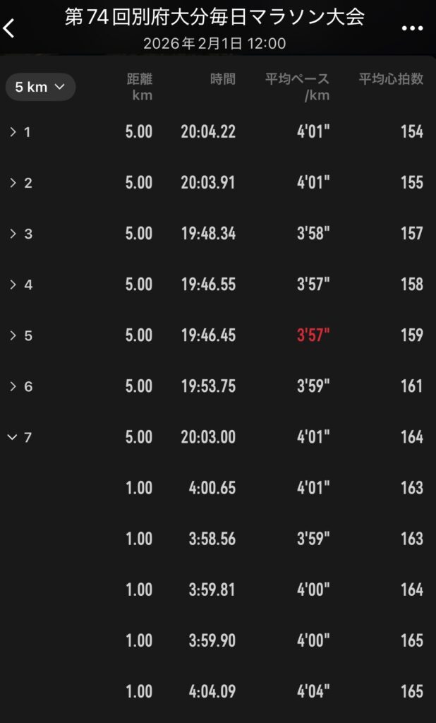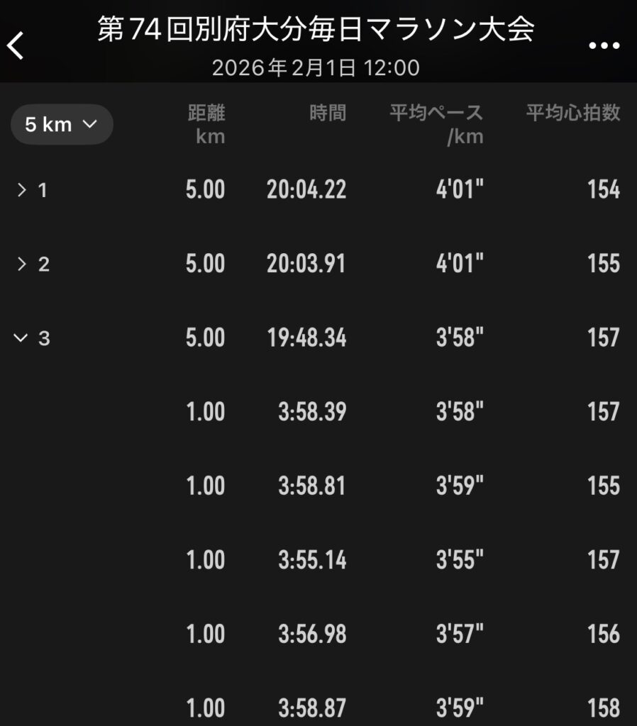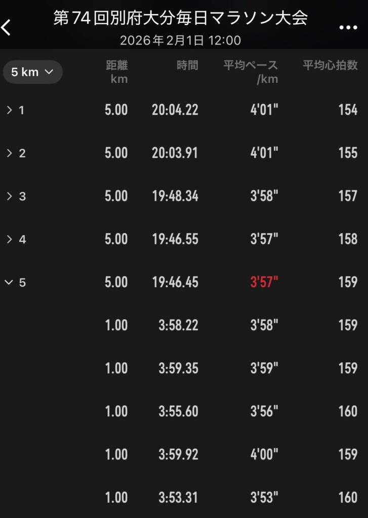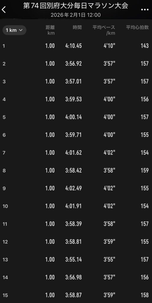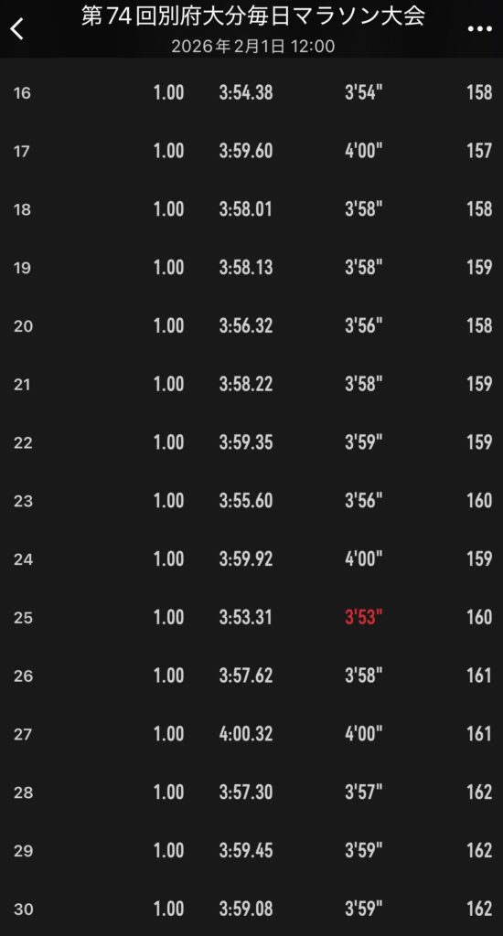 別大1か月前、2025年末の30km試走での手応えから3:58~4:00/kmで30kmをジョグ感覚でクリアすれば、サブエガ達成の可能性は十分にある思いながら、想定通りのレースを展開できたのも大きな収穫です。