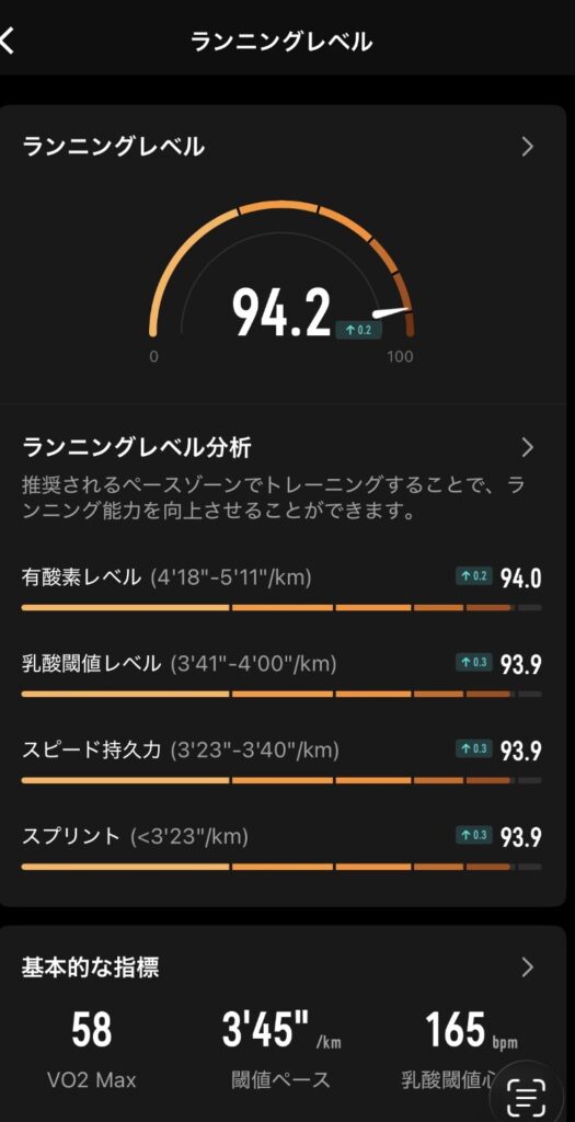 最後に、別大後のランニングレベルの変化、レース予測です。